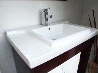 陶器洗面、両側や壁面に歯ブラシやコップなどを!!